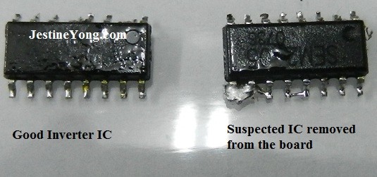 My conclusion was that I made a mistake that I did not resolder the suspected inverter IC first. I should have resolder the IC before putting in a working IC. It was a cold solder joint problem. No worries about this because you can learn from my mistake. My mistake is your gain.