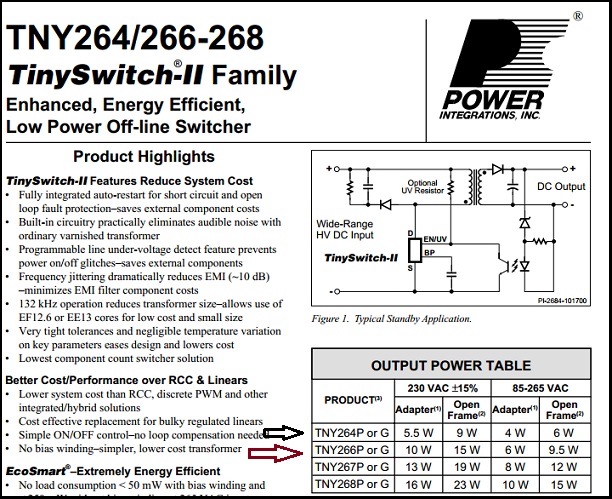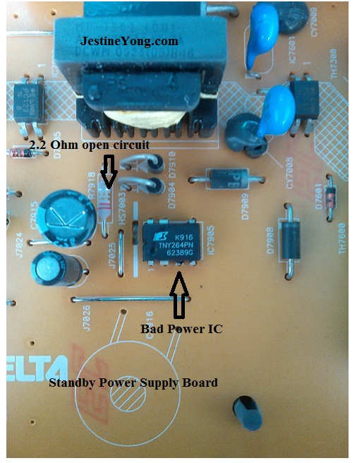 I continued to check on the standby power supply area and found a resistor 2.2 Ohm open circuit. This resistor was connected to the source pin of the TNY264PN IC (8 pins). All corresponding components were checked to be good. Since I do not have this part number I have used another part number TNY266PN. TNY266PN has higher specification than TNY264PN- see the below picture: