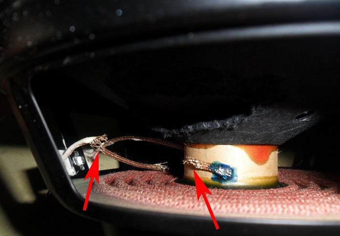 Once the screws of the speaker had been removed my guess was right-the speaker wire was torn and the culprit was the mouse-see the photo below: