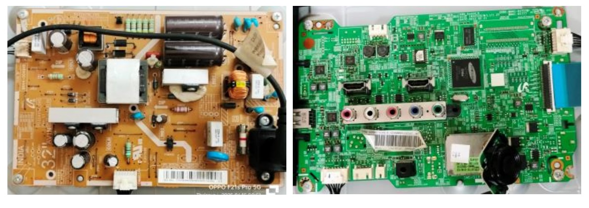 This TV belonged to one of our close family friends and was first brought in January, 2025 due to a power failure. From the label, you could perhaps see that the TV was 12 years old! I had replaced the board as the PWM was not available in the market and the PS board was with PFC circuit. I have submitted a report of this to this forum in yet another article, which is in queue. This time (June, 2025), the complaint was ‘no display, but sound ok!’ When I gently tapped on the screen, the backlight could be seen indicating that the problem was not due to it. I am sharing a couple of snaps of the PS Board and Mother Board below for the sake of refreshment of memory: