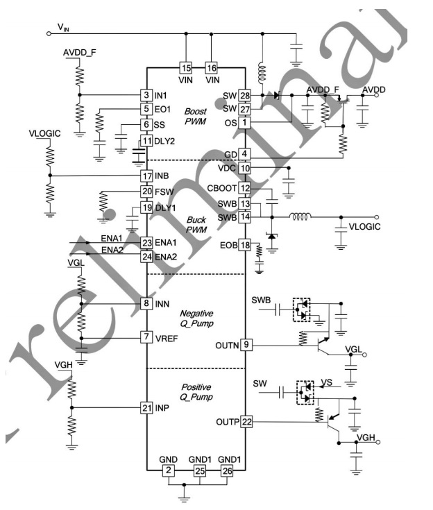 As you can notice, the 12V in goes to pins 15 & 16 to this IC, and builds up AVDD required from the coil and cap. The switching is done by pins 1, 27 & 28, rectified by a diode and smoothed by a cap and controlled by a Mosfet to generate AVDD, which can be clearly seen in the diagram. This IC also generates the VGL & VGH voltages for the panel.