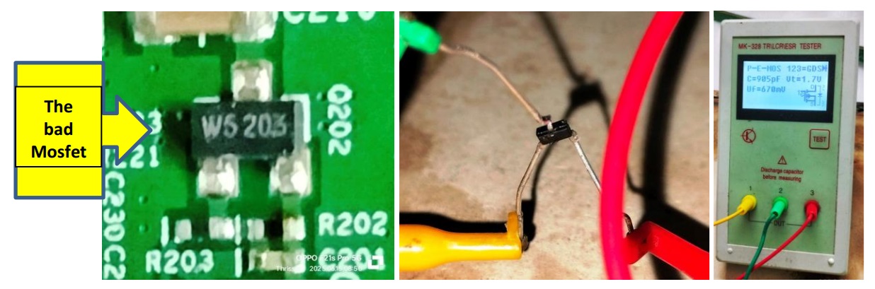 I combed the entire board for any direct short or leak of any SMD caps and did not find any. But one SMD three pin component marked as W5 was found short. The search in the web brought multiple results for W5 including Zener diodes and ICs! As three pins on the board were used, it could not be a Zener. This component was in the AVDD line which went to yet another slave IC before it went to the panel through the COF. So, my assumption was that it was a switching Mosfet used to supply AVDD to the slave IC subject to sense of ideal conditions. I hunted for a replacement of the Fuse, Coil and this component and I got an old scalar board from a techie friend. I removed the required components and replaced it, before which I checked the W5 in the checker, by soldering three legs to it: