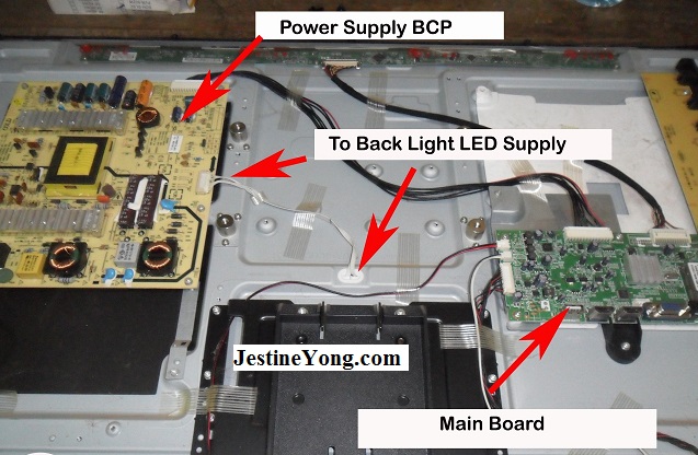 As usual, in order to repair any electronic equipment one has to open up the cover. In this LED TV, it was easy to remove the screws and the cover can be lifted out easily. Once the cover was removed, I could see the mainboard and the power supply/ LED driver board. The LED controller board was located at the top part (long horizontal circuit board).