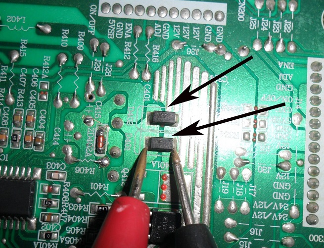 I took out both diodes to check (checking diodes off board is much accurate than to check it on board) and found one was shorted and the other one good-see the two photos below: