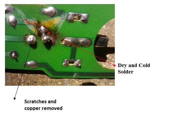 I realized that the machine was worked on sometime back. You can see the scratches and the soldering. This soldering did not have strong contact with the switch terminals. There was dry joints and cold soldering. This makes the switch contacts to move about and eventually causing intermittent transmission of power to the other part of the circuit. I also discovered that the scratch had removed the copper on the board and there was no continuity from the switch to the inductor. I removed the old solder and re-soldered the switch back. I also re-soldered all the other points on the board to control the dry joints and cold solder.