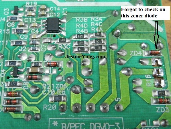 In this repair I’ve actually missed out the 5.1 volt zener diode (ZD4) and because of this mistake the power would not start when powering it up. When i rechecked the power section later did I found that I was actually missed out on this particular component. A replacement brought the power back to life again.