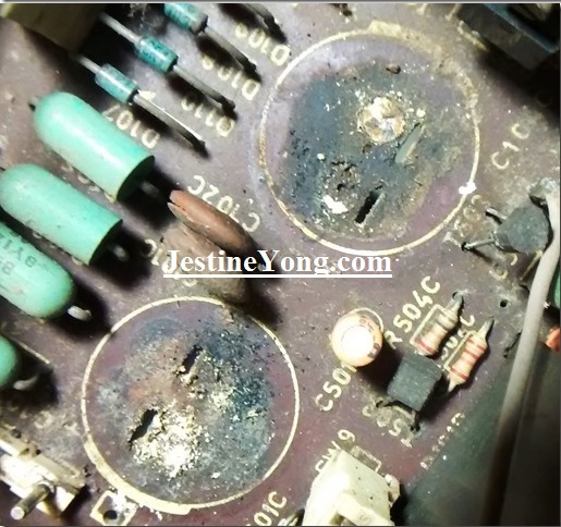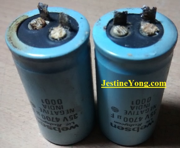Inspected inside, at power supply area, two condensers are heating at the base...may be for ripple of voltage..!
