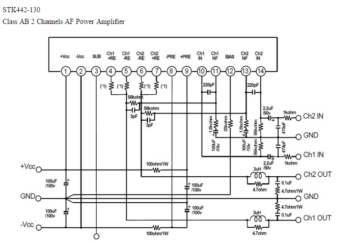 Here is the STK442-130 IC schematic (hard to find datasheet) for you to refer.