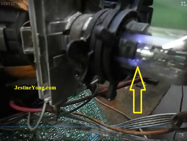 Once the power was On, I heard a sound and it was actually came from the blue spark inside the picture tube-see the photo below: