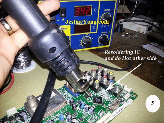 After that I reflowed the main IC chip area using my SMD Rework station gun set to 342 Degree Celcius.