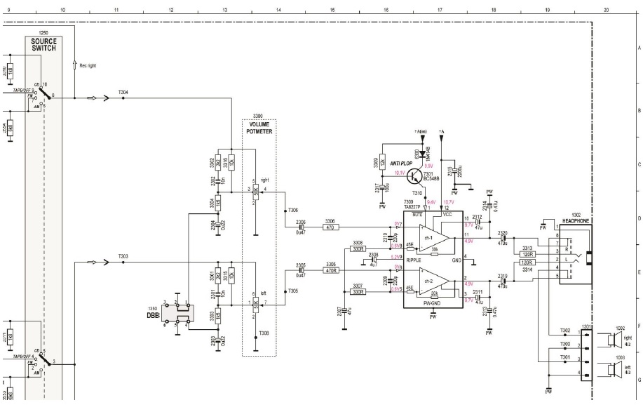Above schematic of the AZ1009 practically uses the identical Potentiometer circuit as the AZ1005 uses. It also shows that it will be very difficult to even replace it by another standard Stereo Potmeter because also the extra Boombox ButtonSwitch is attached to it. And it all won’t work without this special Philips 7 pins Potentiometer! (The AZ1005 numbering is a little different though).