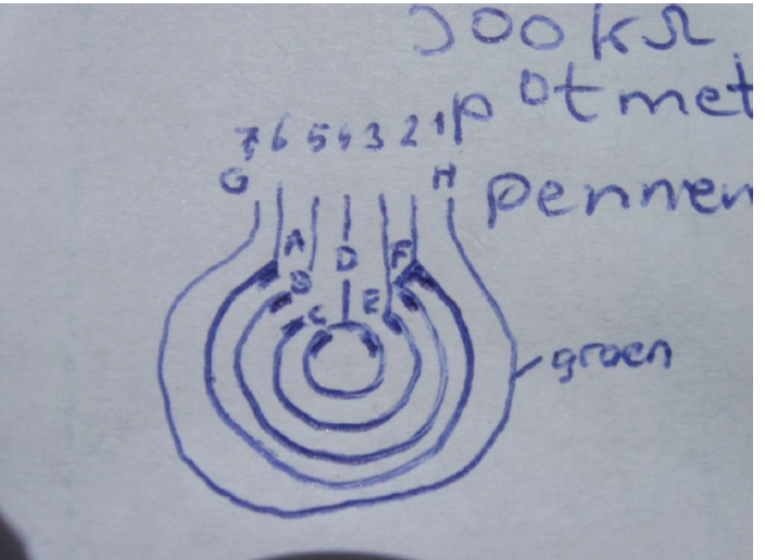 But first I’ll show why the 7 pins Potentiometer was not working anymore. Next Photo shows the inside of this special Philips Stereo Volume Potentiometer after opening. Next I will show the Schematic to explain how this repair will be a succes. And buying a new Potentiometer won’t be necessary anymore – if you could buy one – when you repair the 7 pins Potentiometer just like I did. Notice the scratched carbon layers in the top of the first Photo. In the Potentiometer the middle 3 carbon layers were cut from the outer pins 3 to 5.