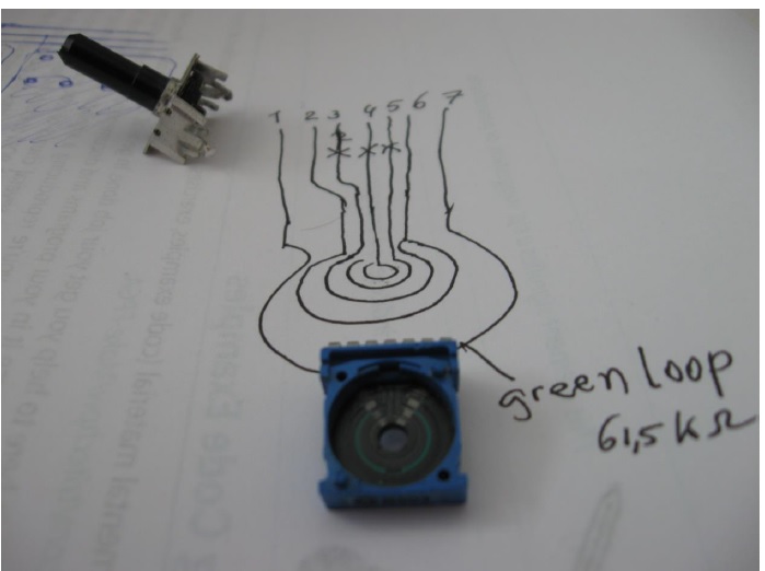 As can be seen on previous Photos there are 7 Potentiometer pins, 4 Carbon resistor tracks, PLUS 1 green track. The next picture shows this more clearly (Component Top View):