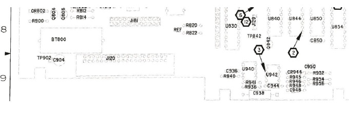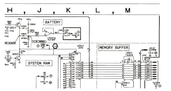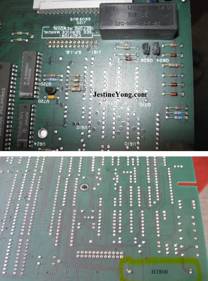 Next picture (page 429 of the Service Manual) is a view of the Battery circuit around the BT800 Backup Lithium. The circuit shows why it is not a good idea to attach a second new lithium to the original BT800. BT800 is connected to CR802 (a type Schottky 1N6263 – see page 8-50 = page370 / 60V, 2.25PF), and also to R900 10KOhm and R802 10MOhm (to the Opamp to detect the Battery Voltage). And if we would attach a new Lithium to an old almost empty Lithium in Parallel, we would only create big trouble. Not only the new Lithium could be drained by the empty Lithium but it even could cause Fire! And if we would place another New Lithium Battery via another 1N6263 Diode to our old circuit, the U940A Opamp (TL072CP) wouldn’t be able to detect the new Battery either!