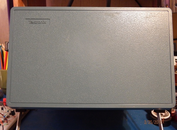 The above picture shows my scope with the front cover on it. It was hard to find one, but I finally did – and it wasn’t cheap either. But I’m glad I found one because it helps protect the CRT and knobs. It also makes taking it apart much easier when I can just stand the scope up on its face without fear of damaging anything.