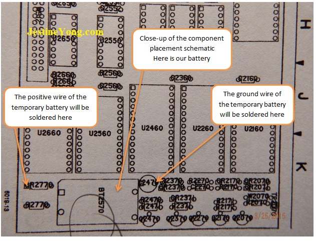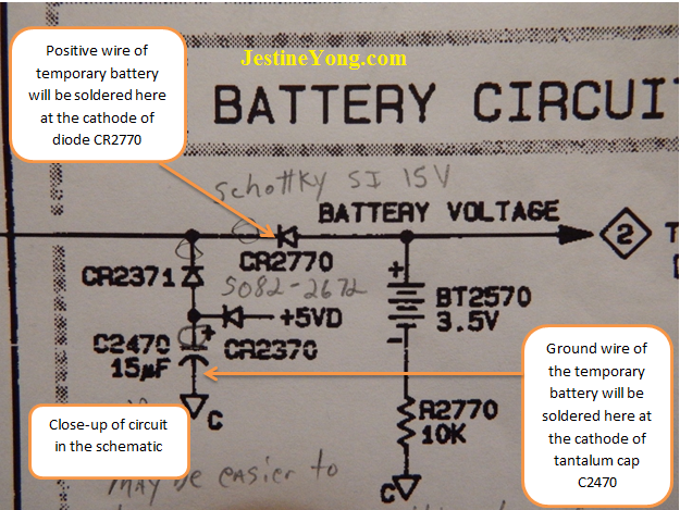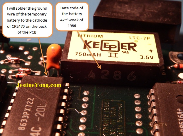 In this photo I show and label the key components in the battery circuit. I will connect the temporary battery positive wire to the cathode of Schottky Diode CR2770, and the ground wire to the cathode of the tantalum cap C2470. That will give me plenty of room to change the batteries without the temporary power wires getting in my way. For my temporary power supply I am using a battery holder that holds 2 AA batteries. If I understood everything right, I will be ok as long as the voltage doesn’t drop below 2 volts. So I should be ok. I am using 2 brand new AA Duracell batteries, so the voltage is a tad over 3.2 volts.