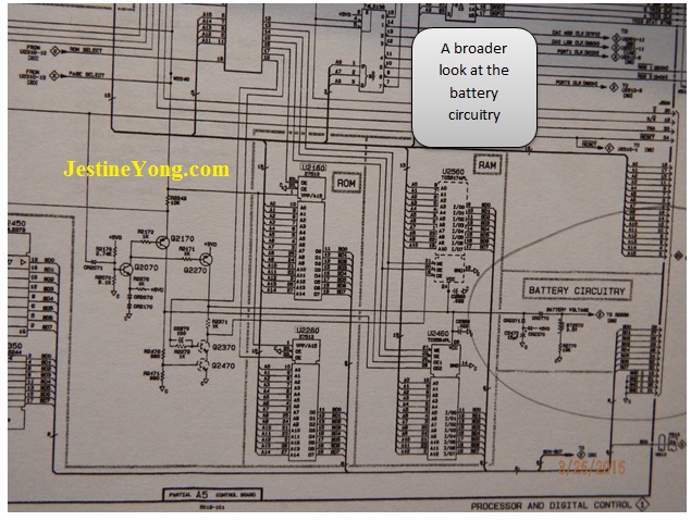 With the cover lifted up and off, we can see the inside of the scope. This is the board that has the backup battery (LTC-7P) at the top. The number for the battery in the schematics is BT2570, which you will see in later pictures of the schematics. Notice how clean the scope is? It’s nearly 30 years old and hardly a speck of dust inside it!