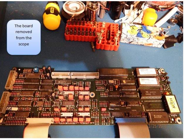 Here the PCB is removed from my scope. The connectors have very little play. So I was real careful removing them. I used small precision screwdrivers to help pry up on the connectors in a little slot at the bottom while I gently pulled and wiggled them out. They were in pretty tight, but not too tight.
