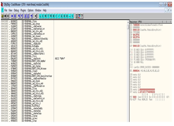 What have we now, we can see now the whole stuff of the programmed code of the CrackMe.exe in assembly language.