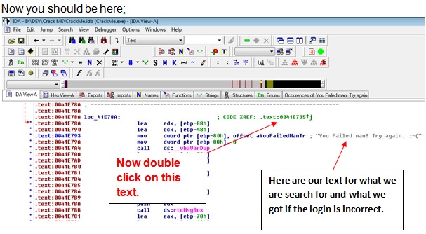 On this line, you can see the magic triggers who decide, should we access the whole program or should we be refused. Can you see the command “JZ” on the right side of the address 0041E735? That is our magic man. The JZ means if something is not equal then go to address 0041E78A. I our case, if you check what is after the 0041E78A address then you can see there is the text “You failed man!…”.