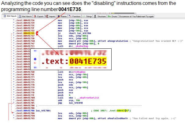 Watch on the left side of the picture, the red dotted line-arrow which shows the program will continue on the line 0041E78A and will not execute the program between the lines 0041E737 and 0041E785, where are our “Congratulation ! You cracked ME! 🙂” text stand what wee need. J