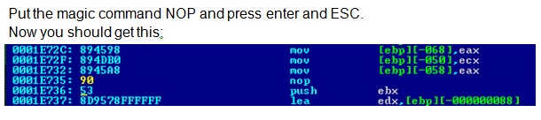 NOP is an instruction for No Operation. We changed the program instruction from a comparing instruction to do nothing. Now the cpu will not compare what we fill in the login field but after the pressed login button they will continue to execute every line after the NOP operation.