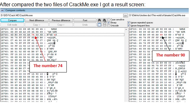 Let’s compare the original CrackMe.exe with the cracked version. This is a simulation of two eeprom dumps. I use the Compare by content function from TotalCommander.