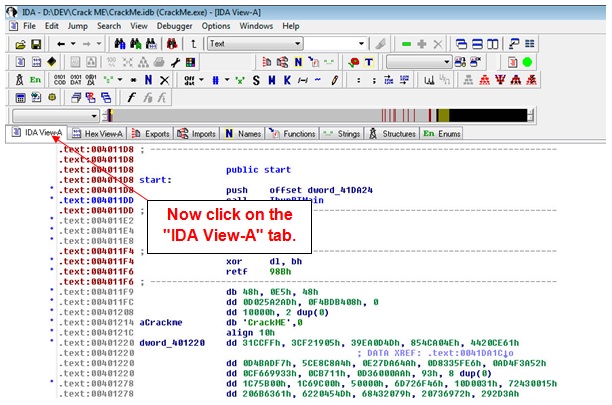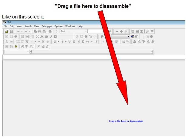 Drag and drop the CrackMe.exe to the disassemble area where the text is standing:
