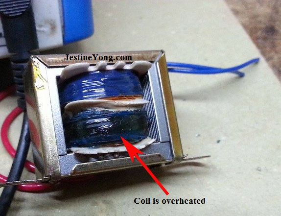 And when I carefully observed the transformer, I saw that there was burnt mark in the transformer probably overheated-see the photo below: