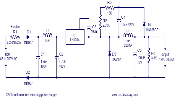 http://www.circuitstoday.com/transformerless-switch-mode-power-supply-circuit