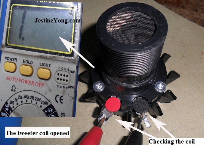 A good coil should show resistance and if you did not get any resistance reading means the coil is open circuit and you need to replace it. In the below photo, you can see that the tweeter voice coil already opened circuit.