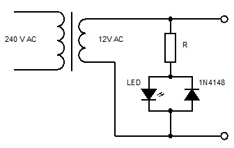 This is a question many people would ask. Diodes usually can stand a certain amount of reverse voltage without breaking down. This maximum reverse voltage, for example, is 75V for the all too famous 1N4148 diode and much higher for rectifying diodes, which can stand up to several hundred Volts. The maximum reverse voltage of LEDs, however, is very low, usually around 5 V! If you connect a LED, with its serial resistor, directly to an AC voltage, for example 12 VAC, your LED will be damaged during the negative half period of the AC voltage. During this half period the voltage will be reversed. The current in the resistor will be very low as the LED doesn’t conduct, so the voltage dropped across the resistor will be low as well. The reverse voltage across the LED will be nearly equal to the peak AC voltage, permanently damaging the LED. But no panic, there are a few solutions. One of the solutions consists of connecting a diode (reverse polarity) in parallel with the LED as shown in this picture. The diode will clamp the reverse voltage to 0.7 V, protecting your LED.