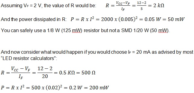 This is a point that is often overlooked, because the power dissipated in the resistor is usually very low and we tend to think that any size of resistor will do. Not always though; it is important to consider the resistor’s power rating if you use very small resistors, such as 1/8W or SMDs. Let’s take an example of a LED under 12V for which we selected a Forward Current of 5 mA: