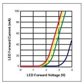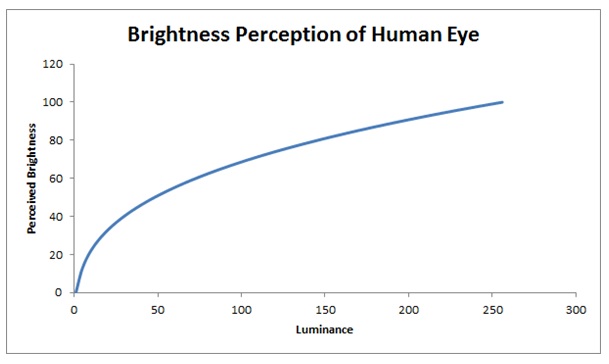 You may wonder why, for most of those LEDs, there is no visible change in brightness between 5 mA and 10 mA as the Luminous Intensity is supposed to double based on the graph we have just seen? The reason is because the brightness perception of the human eye vs. the luminance is not linear. The human eye is more sensitive at low luminance than at high luminance. We can see this by the fact that the LED’s brightness visibly increases when we increase the current from zero until a point after which it doesn’t seem to increase any more, even if we double the current. This is represented by the graph below.