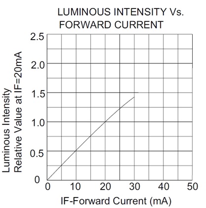 The value of IF depends on the luminous intensity you want. The relation between the Forward Current and the Luminous Intensity is another LED’s characteristic as shown in this picture. The Luminous Intensity is usually given as a relative value compared to what it would be when IF = 20mA. On this graph, for example, we see that when IF = 10mA the Luminous Intensity is half of what it is when IF = 20 mA. Indeed for this particular LED the characteristic is almost linear and you will find out that it is the same for most LEDs.