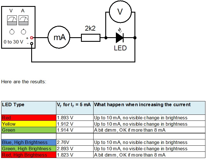 To illustrate the above I put a few LED’s from my junk drawers under test, and checked how they behave, starting with 5 mA and then looking at what happens when we change the current. All it takes is a variable power supply, two multi meters and a resistor. Of course also the LED to be tested:
