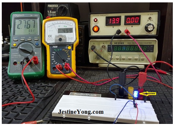 For example, this blue LED is already very bright at 5 mA, then we do not see much difference if we increase the current up to 10 mA or more.