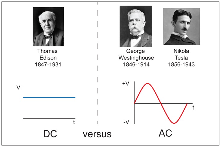 In fact, the question was still open when the world’s electrification began in late 1800’s, and remained open for quite a long time, opposing two companies in what was called the “War of Currents”. Edison Electric Light Company founded by Thomas Edison (1847-1931) promoted DC, while Westinghouse Electric Company founded by George Westinghouse (1846-1914) and backed by Nikola Tesla (1856-1943) promoted AC.