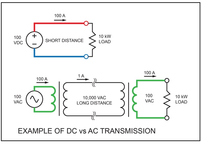 AC supporters argued that they could easily step up the voltage using transformers, then transport electricity over much longer distances. The idea is simple, to supply 10 kW under 100 V would need 100 A (I = P/V). The same 10 kW under 10 kV would need 1 A only! Less current means smaller wires (less copper) and fewer losses in the line. On the other side, DC could not be transformed easily (at that time) and would have to be generated and transported at the user’s voltage. This would need huge cables to transport a large amount of power; hence DC was not suitable for long distances. The figure below illustrates this advantage (ignoring the losses in the transformers for simplification!):
