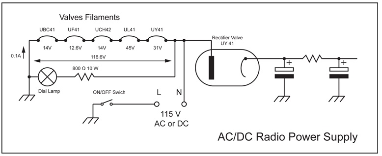 I can remember fixing those AC/DC radio receivers still common in the 60th and I almost died on one of those… They were transformer less, hence a real danger as one side of the mains would be connected to the chassis, depending on which way you inserted the plug. One of the designer’s challenges had been the vacuum tube filaments which, on other types of radio receivers, were all connected in parallel to a 6.3 VAC winding of the transformer’s secondary. As AC/DC receivers had no transformer, special vacuum tubes were designed for this application. All the tubes filaments were designed for a common current of 100 mA with different voltage drops depending on the tube’s power requirement, so they could be connected in series. The total voltage for 5 tubes filaments in series would be approximately 115 V. In the US those receivers were named “All American Five” as they had five vacuum tubes and could be used anywhere in America whether the supply was AC or DC! The European version used a large resistor to drop the filament voltage from 220 V down to 115 V! The figure below shows one of the versions of those AC/DC radio power supplies. There were several variants but all based on the same principle. Interesting to note on the figure below that if you reverse L and N the chassis will be Live through the chain of filaments when the switch is OFF. This is why I nearly died…a real danger!
