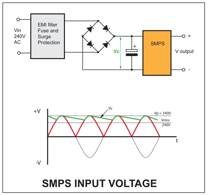 – What about most of the SMPS used as chargers or power supply for our electronic apparatus and gadgets. Would they work if we supplied the same voltage in DC instead of AC? My feeling was a yes, because they convert the AC input into DC anyway. But I was a little worried about the voltage. When you convert AC into DC using a rectifier and filter capacitor the resulting voltage will be higher than the AC rms value, actually around 1.41 times the rms value… So an input of 240 VAC (rms) will result on around 340VDC. The figure below illustrates this: