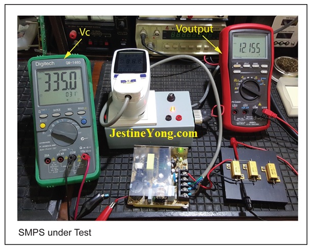 To make my point and learn a bit more I could not resist putting an SMPS under test. First I connected the SMPS into its normal conditions to confirm the voltage across the filter capacitor: