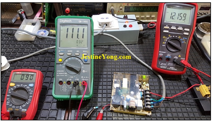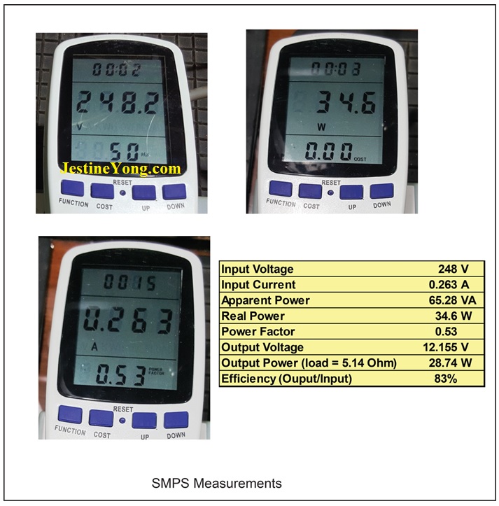 This SMPS is rated 100-240 VAC, which will correspond to around 141 to 340VDC across the capacitor (remember we multiplied by 1.414). With 240 VDC we are well into specs. But will it work under 110 VDC? Theoretically not because it would be out of our 141-340V range but let’s try: